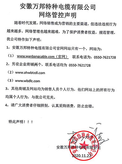 鄭重聲明:安徽萬邦特種電纜有限公司官方網站為:www_wanbangcable_com.ykjunfei.com,除此之外無任何子網站或合作網站,其余均為假冒偽劣。電話:0550-7621728 13485756353 地 址:安徽省天長市滁州高新技術產業開發區經四路29號